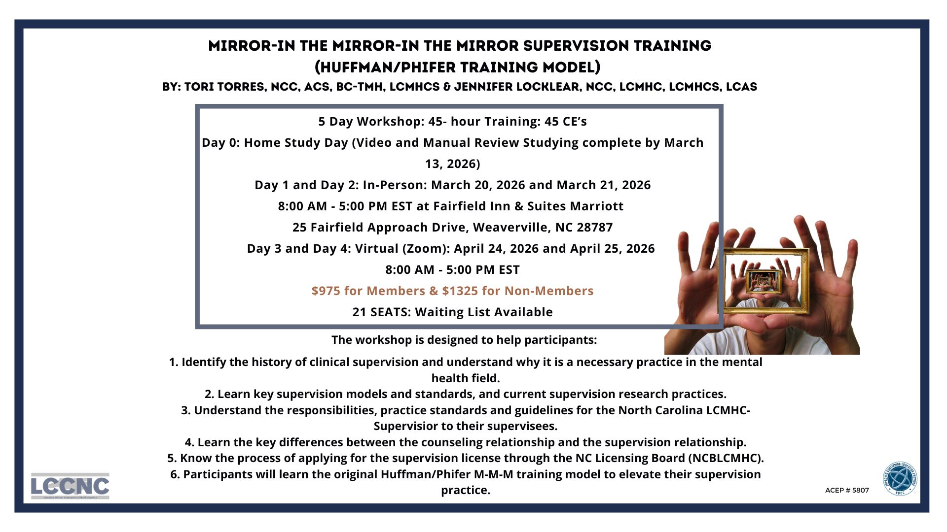 This program is an LCCNC original presentation... created BY Counselors FOR Counselors. If you are a LCMHC with five or more years of professional clinical experience, you qualify to apply for your supervisor license! One of the first steps on your supervisor journey is to get the required 45 hours of supervision training required before applying for your 'S' to the licensure board.