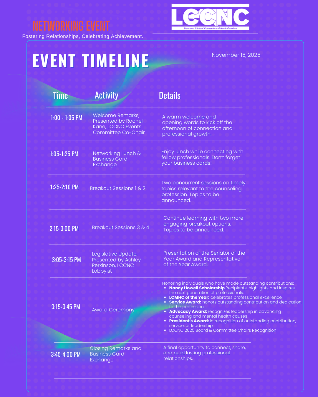 During the event, LCCNC will proudly announce the recipients of the 2025 LCCNC Awards and present them with their awards. Additionally, the Nancy Howell Scholarship recipients will be revealed, honoring excellence and dedication in our field.