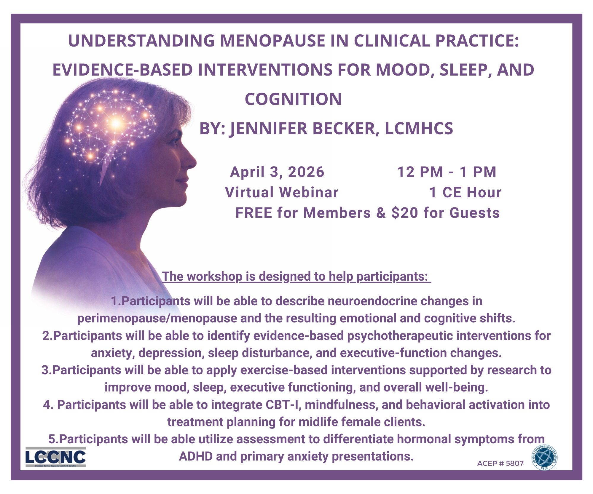 Attendees will receive treatment frameworks incorporating CBT-I, mindfulness-based interventions, behavioral activation, and exercise as a therapeutic tool. In this 60 minute virtual presentation, attendees will be equipped to treat perimenopause-related distress with measurable, evidence-based strategies.